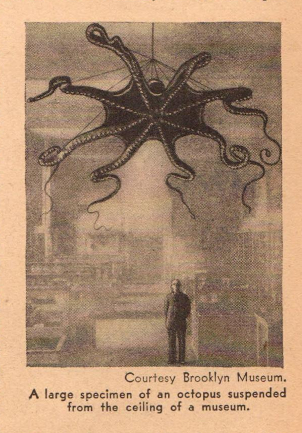 Tentacles in the Brooklyn Museum, 1931. Found while flipping through Science and Invention magazine for March 1931, newly on Archive.org. An initial search suggested there was also a giant squid, as the modern book Brooklyn Museum of Art: Building for the Future talks of their having once been natural history galleries and a specific section for… “Invertebrates housing not only display cases of specimens but also large models of a squid and an octopus suspended overhead”.