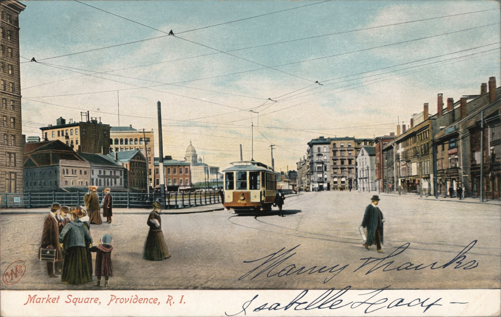 * And finally, a rare street-level view of the Market Square, Providence, as Lovecraft would have encountered it. Many other postcard views are elevated or bridge-views. The view here is north towards the State House dome. The city’s market was held around the railings on the left of the picture. One can almost imagine the fellow alighting from the tram car, holding a black bag, to be the young Lovecraft.