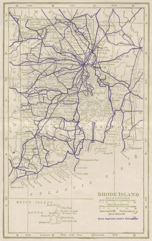 * Browsing eBay for scans, I’d not seen this one before. A pleasing and unwatermarked map of the highway system in Rhode Island, 1925. Could be upscaled to become a good RPG game prop?