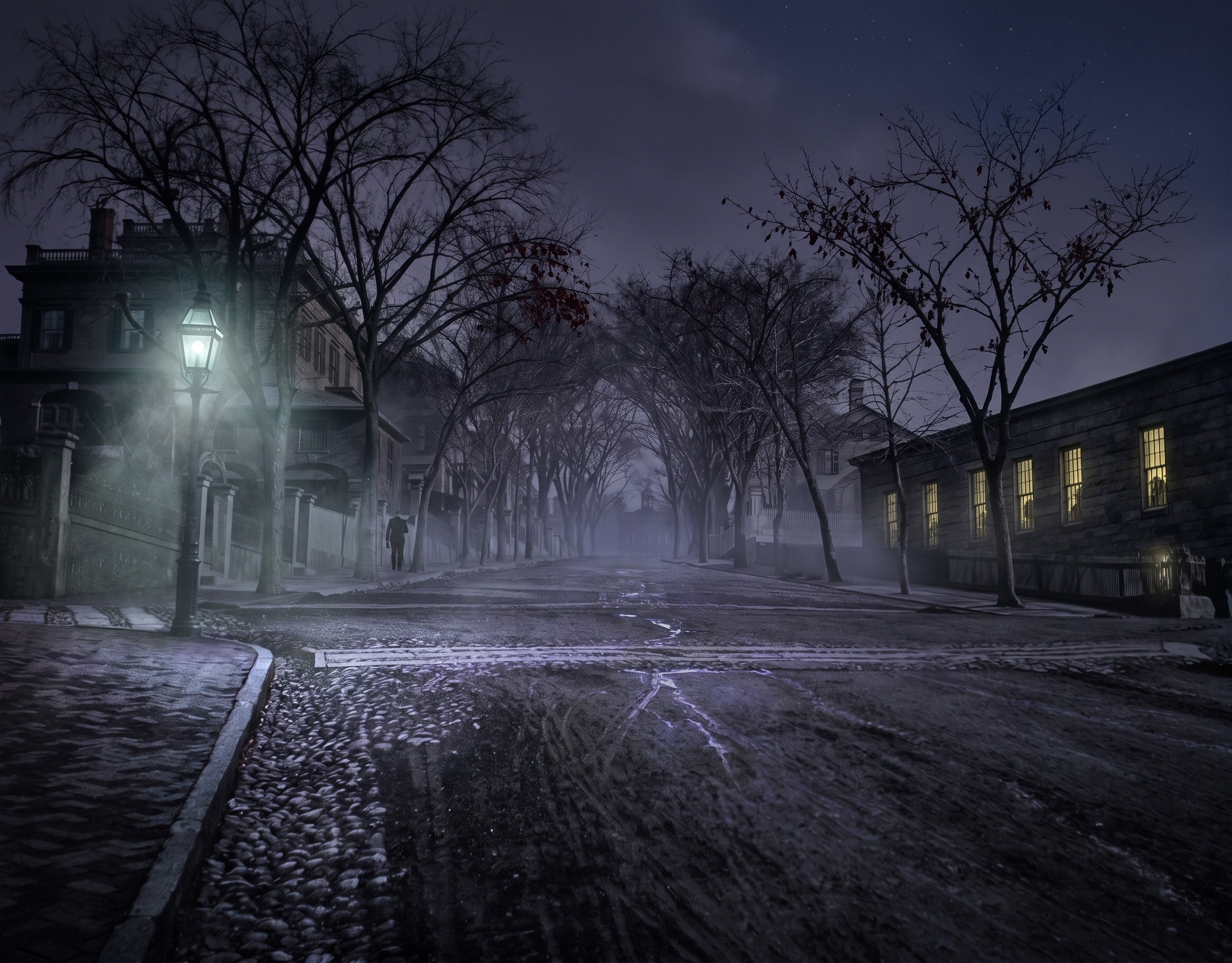 * Talking of AI tools, yes… we can now re-style images so they more-or-less evoke Providence at night in Lovecraft’s time. Here’s ‘Lovecraft returns home up College Street at night, in the late 1920s’. Made with two Nano Banana day-to-night re-styles of a vintage public-domain image, plus my Photoshop-addition of HPL and the black bag he often carried.